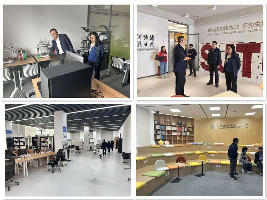 史红梅一行在韩海波的陪同下参观了溥渊未来技术学院学生活动中心、溥渊创新中心,全方位了解学院文化和支撑学生成长成才的设施保障情况。