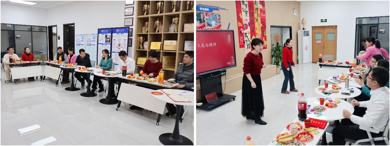 李涛代表学院党委向全体教职工致以诚挚的新年祝福。她回顾了学院2025年在学科建设、人才培养、师资队伍建设等方面取得的丰硕成果,深情致谢全体教职工一年来的恪尽职守与辛勤付出,鼓励大家以更饱满的热情投身新一年的工作。
